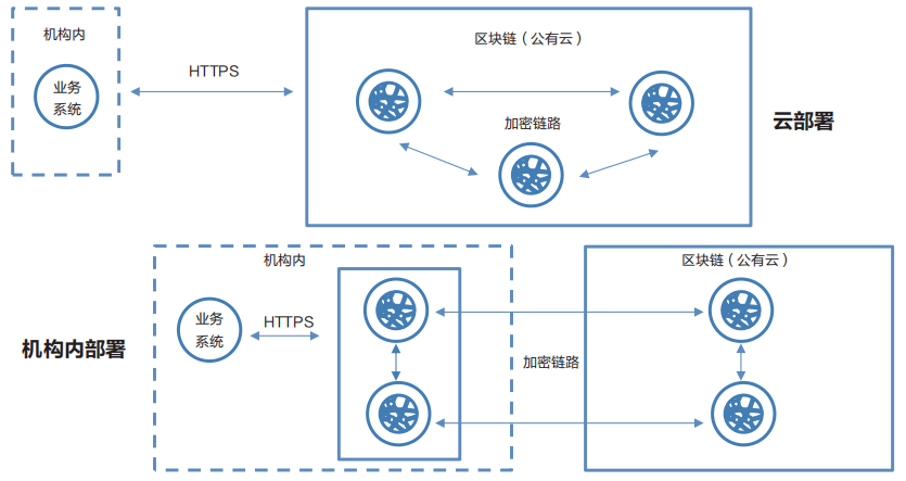 区块链节点部署在机构内,业务系统通过HTTPS协议与部署在机构内的节点通信,这些节点通过加密链路与部署在公有云上的区块链节点通信,进行业务处理。